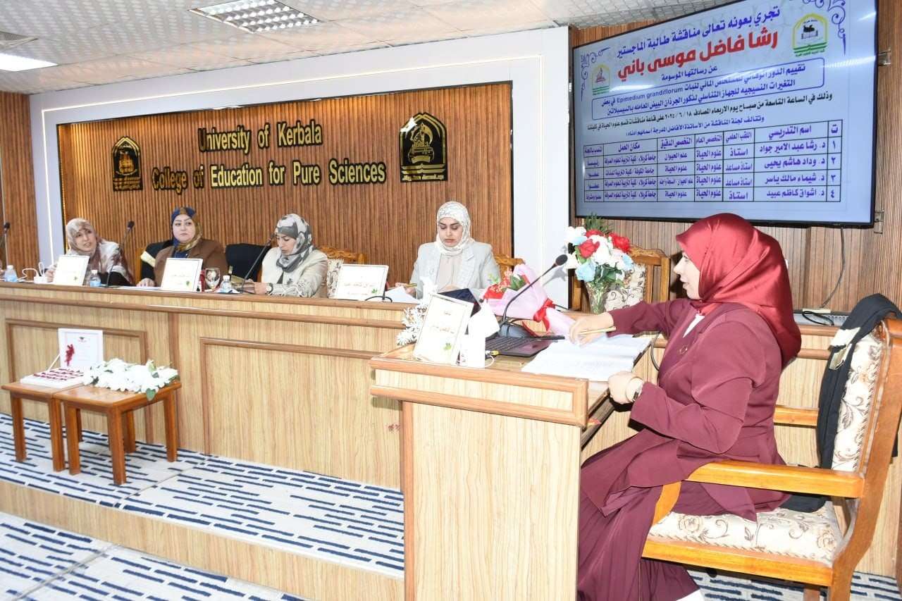 حضر السيد المساعد العلمي مناقشة للطالبة (رشا فاضل موسى باني) عن رسالتها الموسومة ( تقيم الدور الوقائي للمستخلص المائي لنبات (epimedium grandiflorum) في بعض التغيرات النسيجية للجهاز التناسلي لذكور الجرذان البيض المعاملة بالسيسبلاتين وذلك في الساعة التاسعة من صباح يوم الاربعاء المصادف 18/6/2025 على قاعة مناقشات قسم علوم الحياة في كلية التربية للعلوم الصرفة